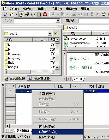 ★作好上述設(shè)置好,在"站點(diǎn)管理器"窗口中,雙擊剛才建立的上傳站點(diǎn),就可以登錄到服務(wù)器了。 ★成功登錄服務(wù)器后,窗口自動跳轉(zhuǎn)到左邊的"本地驅(qū)動器"子窗口中,選擇你要上傳的一個或多個本地文件,然后右擊選擇"上傳"就可以了。 ★你可以點(diǎn)擊最上面的"stop"圖標(biāo)停止上傳,如果要繼續(xù)上傳,右擊下面?zhèn)鬏旉?duì)列中的的文件,選擇"全部傳送"或者"傳送選定"即可。也可以選擇"移除選定"或者"全部移除"等菜單刪除傳輸隊(duì)列。如圖4。