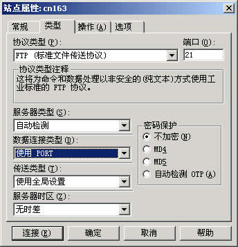 ★本公司一些服務(wù)器因?yàn)榘踩O(shè)置的關(guān)系,必須使用"port"方式登錄才能正常上傳文件,這時,需要您在上面窗口中點(diǎn)擊"類型"選項(xiàng)卡(如圖3),在"數(shù)據(jù)連接類型"下拉框中選擇"使用 PORT",再點(diǎn)擊"確定"就行了。