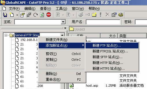 ★使用中國杰聯(lián)網(wǎng)空間,由于服務(wù)器的安全設(shè)置,請最好使用Cuteftp Pro進(jìn)行上傳,以避免使用其它軟件可能造成的麻煩! ★Cuteftp Pro下載地址: ★請點(diǎn)擊這里:下載Cuteftp Pro漢化注冊版 ★Cuteftp Pro安裝說明: ★下載上述壓縮包后,請使用winrar解壓到本地硬盤某個目錄下。 ★請查看里面的幫助文件,按照說明進(jìn)行安裝即可。 --==FTP上傳軟件使用==-- ★打開Cuteftp Pro,點(diǎn)擊左邊窗口"站點(diǎn)管理器",右擊"General FTP Sites"(如圖1),在出現(xiàn)的菜單中選擇"添加新站點(diǎn)"-->"新建FTP站點(diǎn)"。